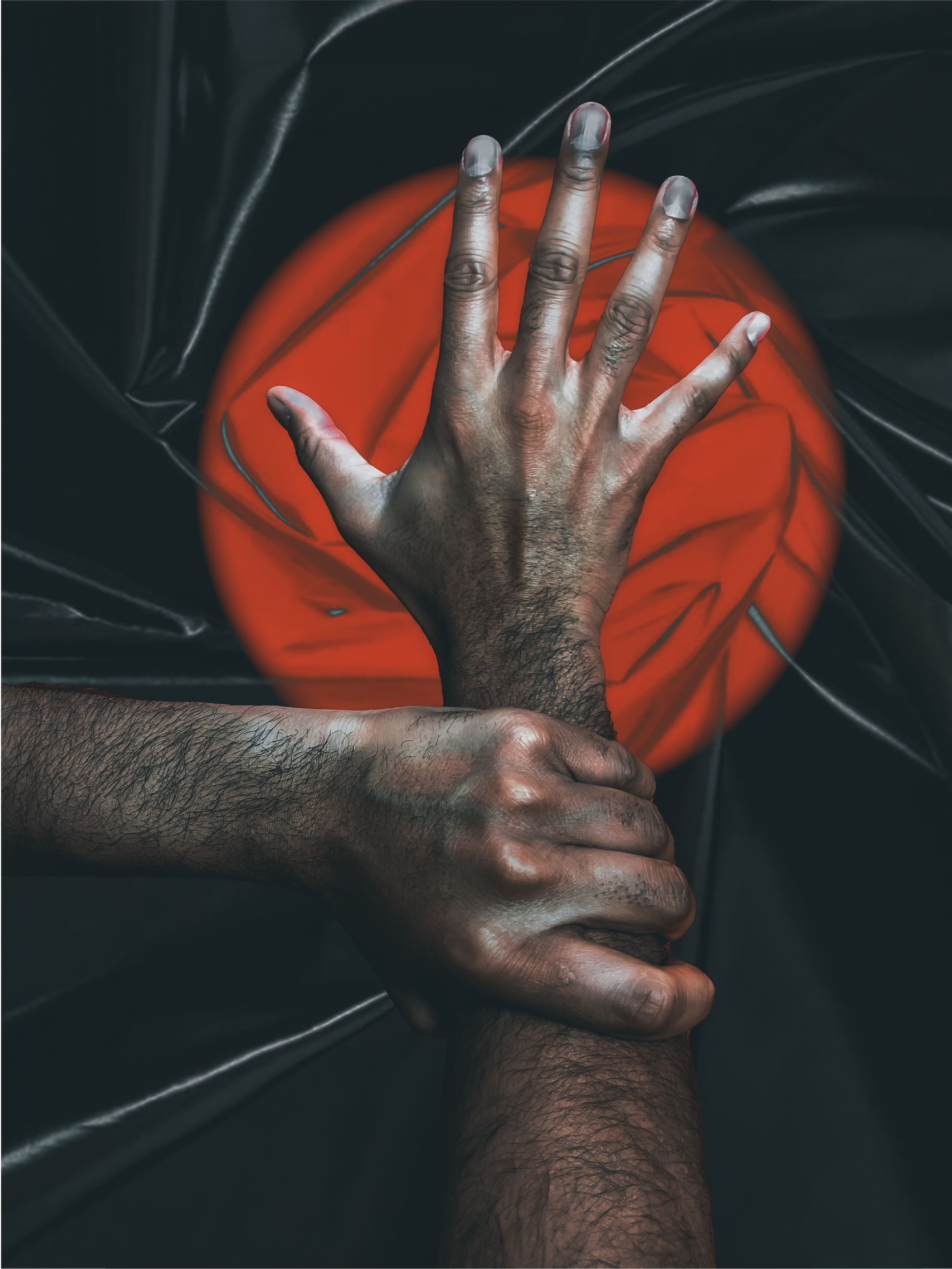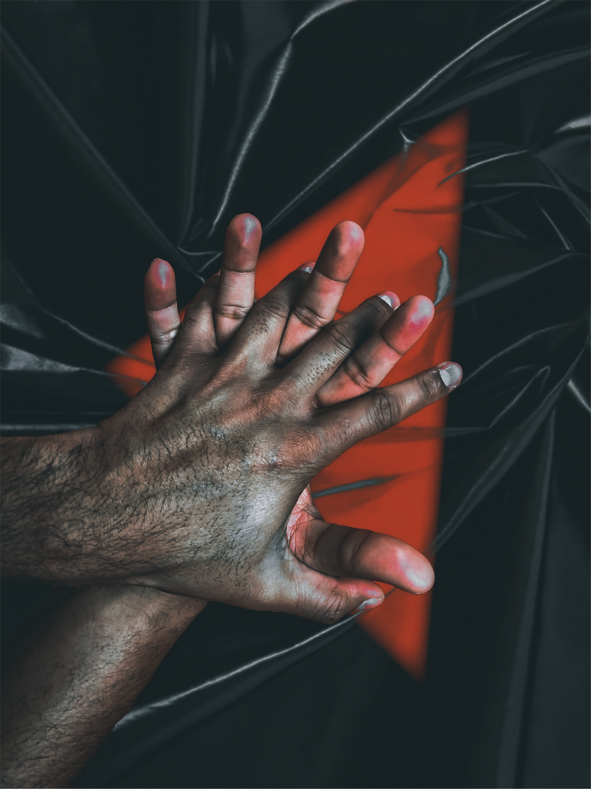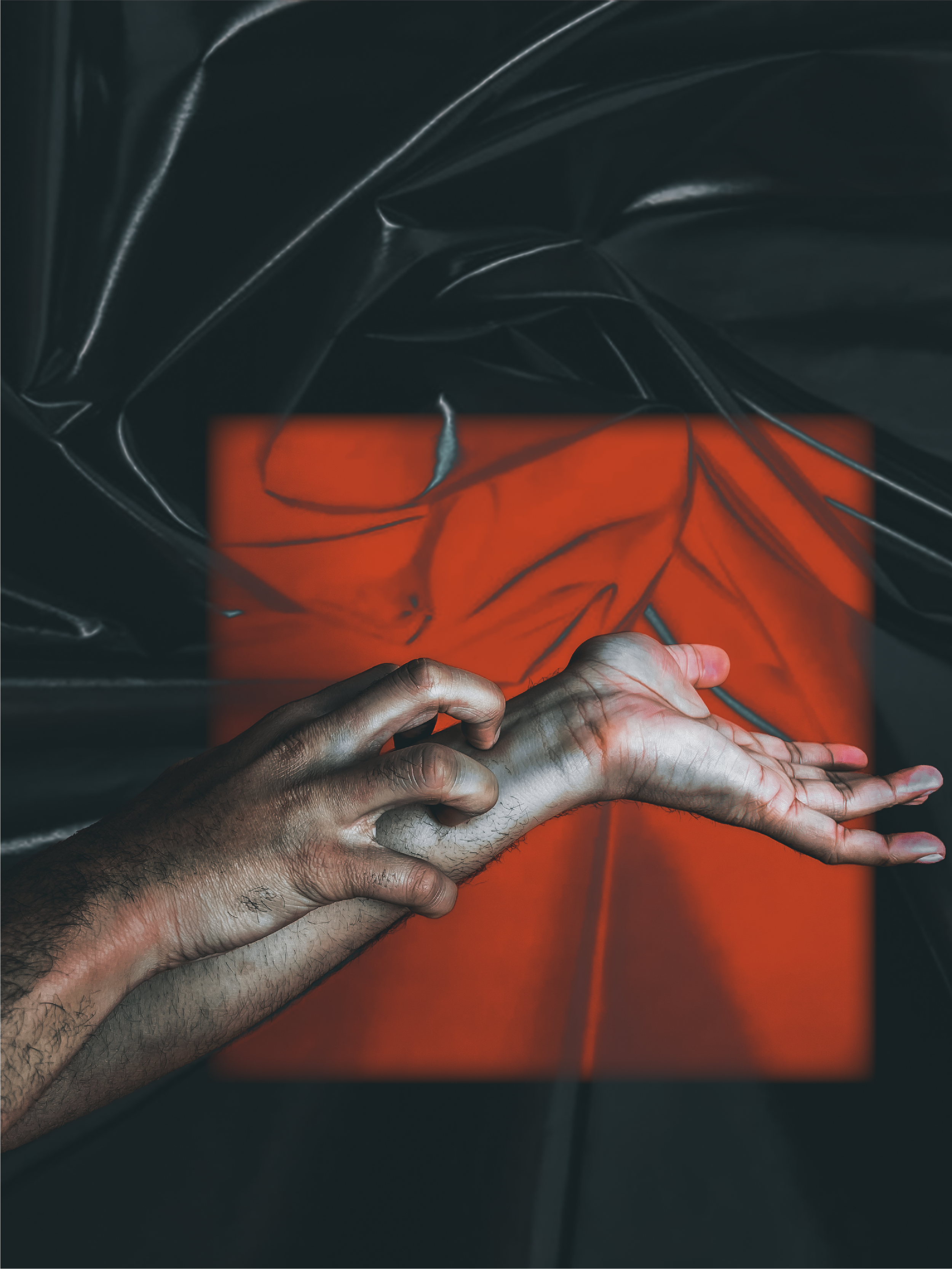 This artistic creation sheds light on the intricate dichotomy between domination and passion. The black and red color palette serves as a powerful visual metaphor for the complex relationship between two individuals and underscores the intense and emotional connection between the two hands, conveying a story of entanglement and tension that is both captivating and thought-provoking. The presence of latex in the background furthers this narrative by alluding to the relationship that teeters on the line of exciting and dangerous.